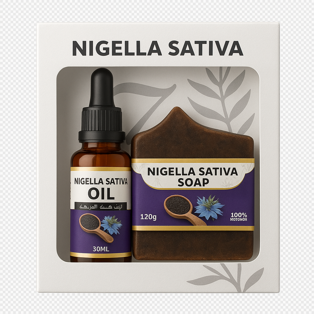 🖤 مجموعة العناية بزيت وصابون الحبة السوداء — سرّ الجمال الطبيعي والنقاء العميق لبشرتك وشعرك