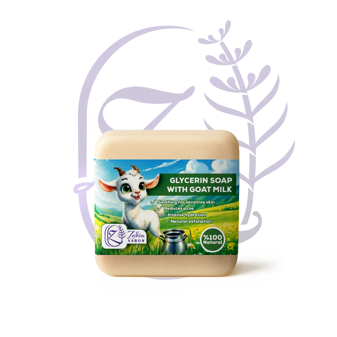 .صابون طبيعي لطيف مصنوع من الجلسرين المرطّب وحليب الماعز الغني بالفيتامينات (أ، ب، د، ه) والمعادن
